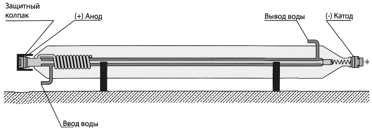- Подсоедините водяные патрубки с обеих сторон вход – снизу (со стороны положительного полюса) , выход воды – сверху (со стороны отрицательного полюса и выхода луча)